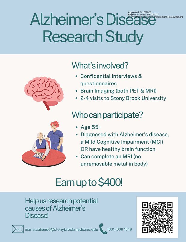 We are looking for volunteers ages 55 or older to participate in research studies to better understand memory impairment and Alzheimer’s disease. Volunteers who speak English fluently, either with or without memory problems, are eligible for the study. The study involves brief testing for memory and cognition and blood draw, with the total time commitment will be about two hours. Compensation is up to $60 for completing all study procedures. To learn more about our research, please contact Maria Caliendo at (631) 638 1548 or maria.caliendo@stonybrookmedicine.edu.